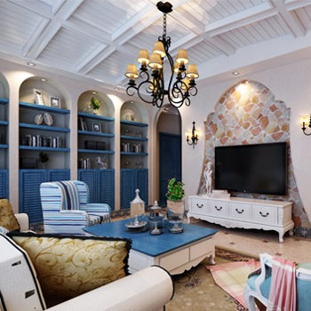 本方案在平面功能上做了合理化與人性化的布局,結(jié)合了業(yè)主的需求。提煉了地中海區(qū)域的色彩和建筑特點(diǎn),結(jié)合新材料、成熟的工藝來(lái)表達(dá)以藍(lán)色為氣息的地中海風(fēng)格,從分體現(xiàn)了希納地域與西班牙地域的地中海特點(diǎn)。材料說(shuō)明:仿古磚,板巖、馬賽克、赤陶、玻璃片、玻璃珠、拱形實(shí)木門(mén)、木質(zhì)假梁仿舊漆、墻面采用手掃漆、鐵藝、手工原生態(tài)制作櫥柜工藝、實(shí)木紋地板。