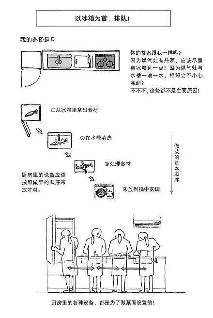 廚房的設(shè)施布置應(yīng)該按照做菜的順序來,從冰箱拿出食材-清洗-處理-烹調(diào),要符合廚房的操作流程,胡亂設(shè)置廚房設(shè)施的話,累的一定是你……