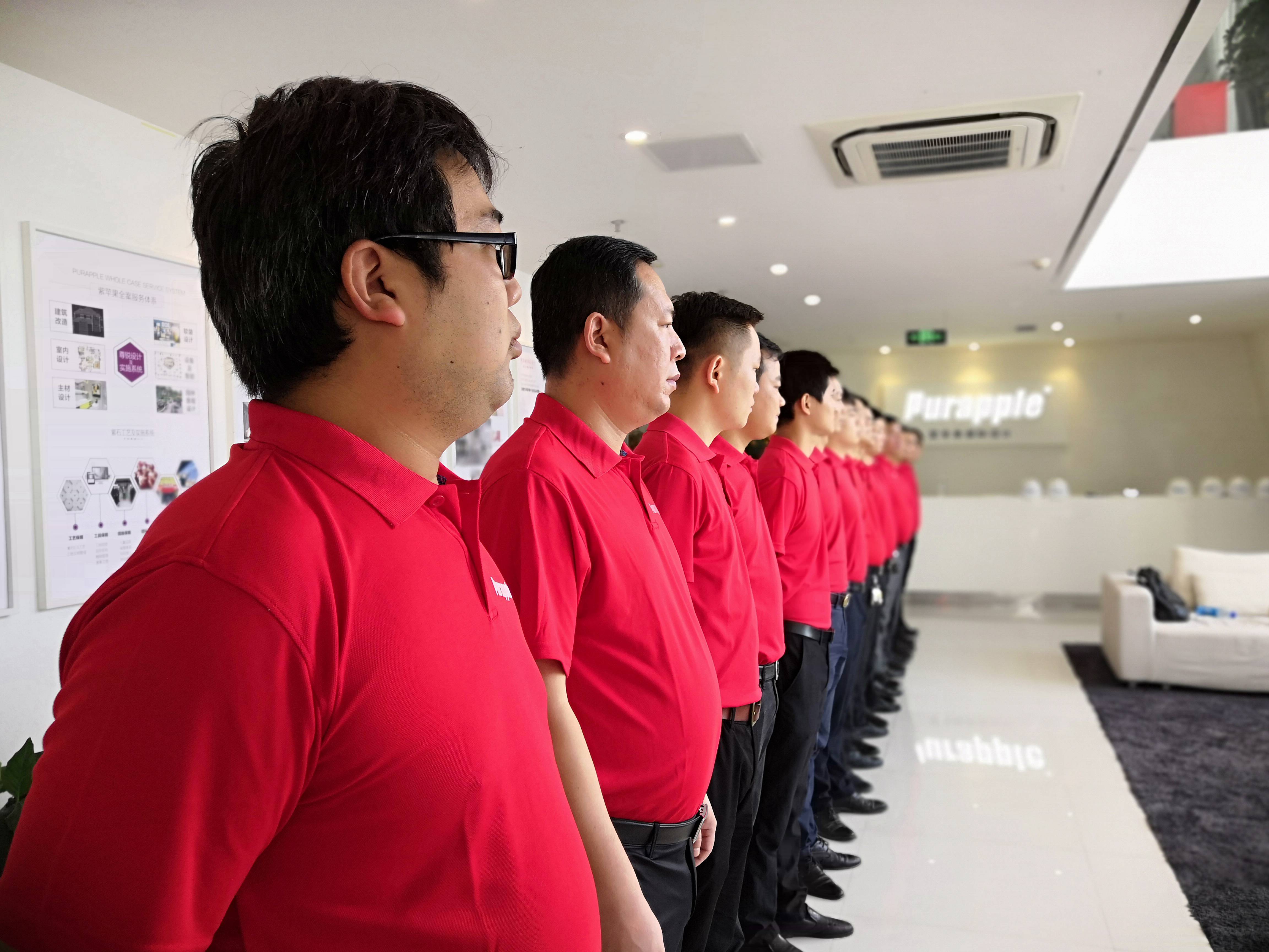 公司整隊,大家喊著齊刷刷的紫蘋果的專屬口號鼓舞士氣