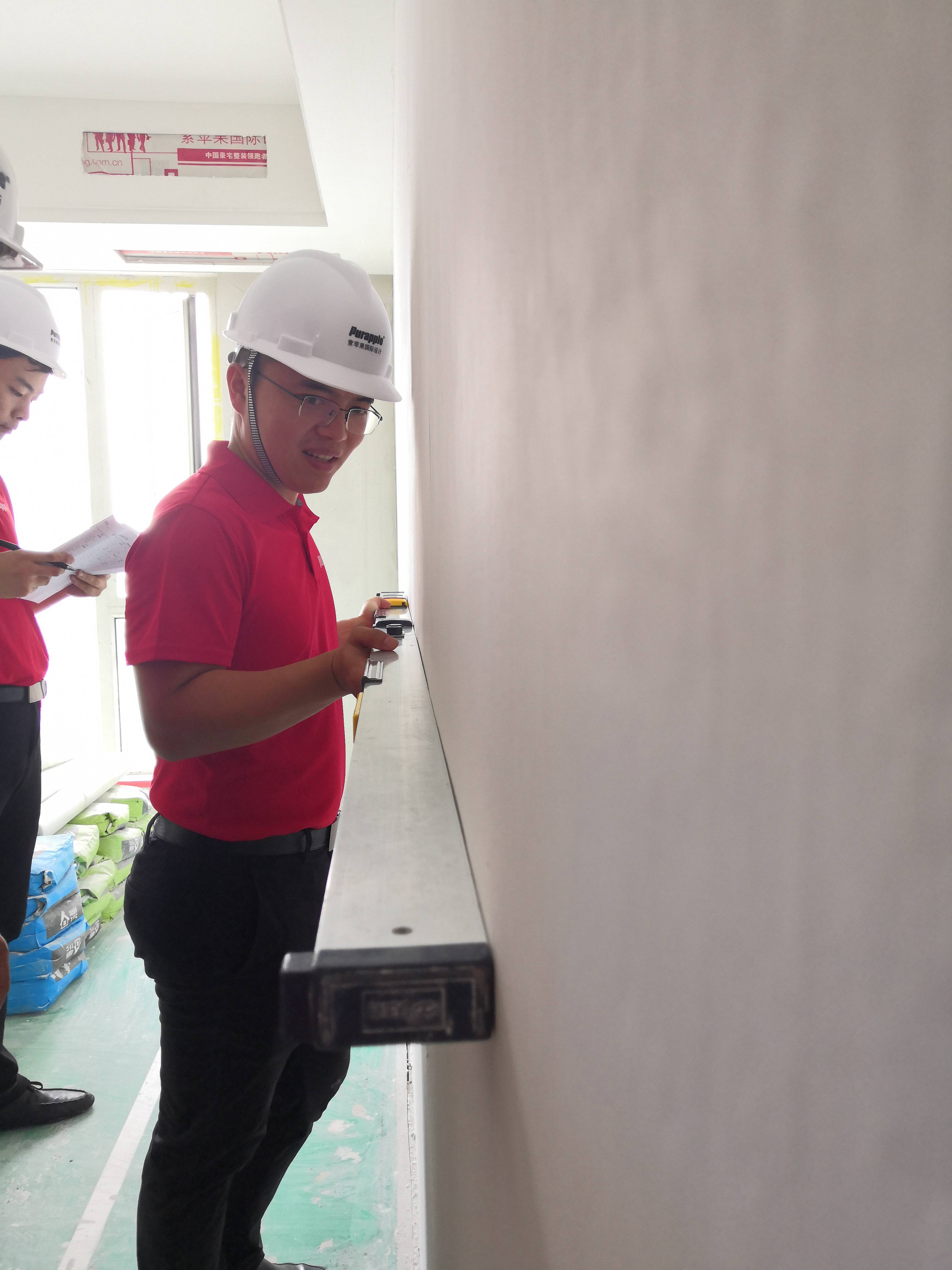 墻面平整度檢查,每個人都拿出百分百的認真勁,用“雞蛋里挑骨頭”形容大家的認真絲毫不為過