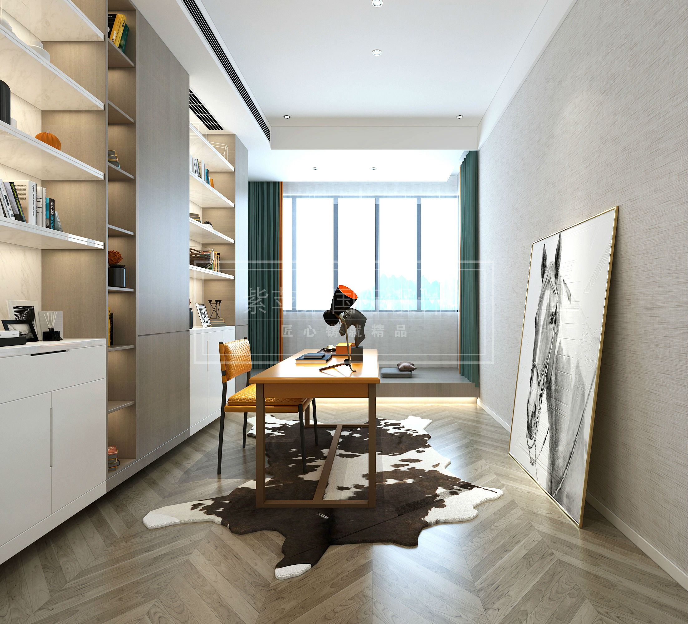 這樣會(huì)讓空間顯得緊湊有致,節(jié)約了不少居室空間。書桌和書柜以簡單的黑白配色,會(huì)顯得干凈整潔。小戶型書房在地面適宜選擇木制地板,加上地毯則裝飾效果更好,防噪聲效果會(huì)更好;在墻面則采用吸音的壁紙、板材。