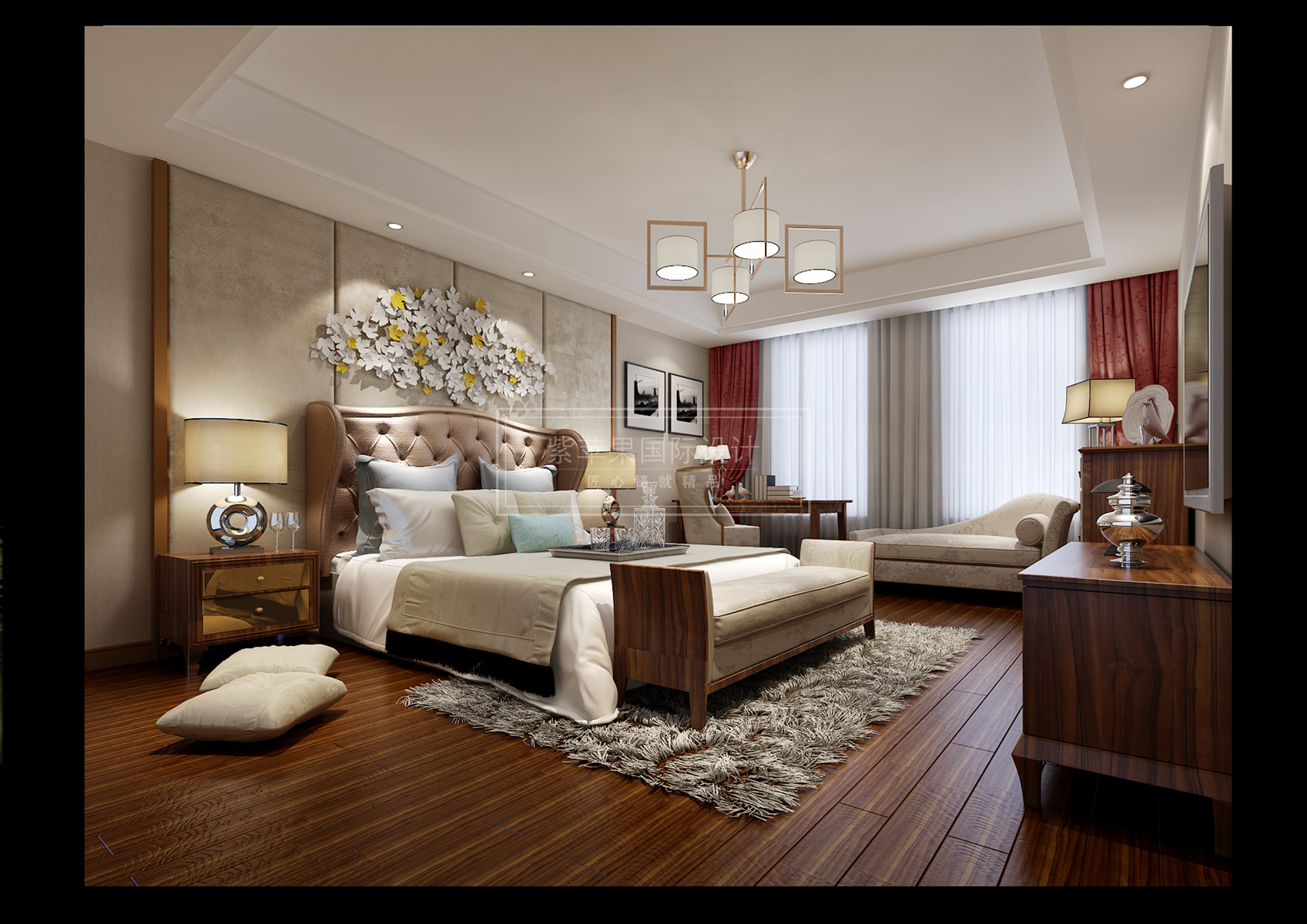 臥室內(nèi)色彩宜淡雅,色彩的明度宜低于客廳,同時(shí)可以用床蓋、窗簾、靠墊等軟裝飾的色彩與質(zhì)地營造室內(nèi)氣氛。