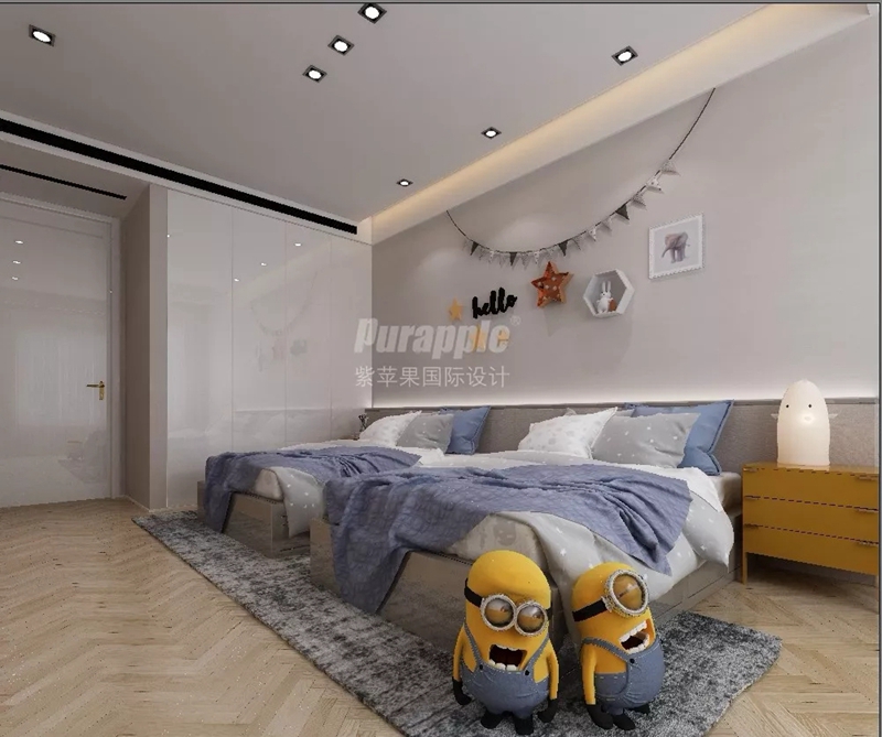 兒童臥室,選擇了與主臥相似的極簡(jiǎn)白色吊頂,灰色的床頭柜造型,也是質(zhì)感十足,極簡(jiǎn)童趣的床頭掛飾和可愛(ài)的床頭燈瞬間提升空間的靈動(dòng)性。