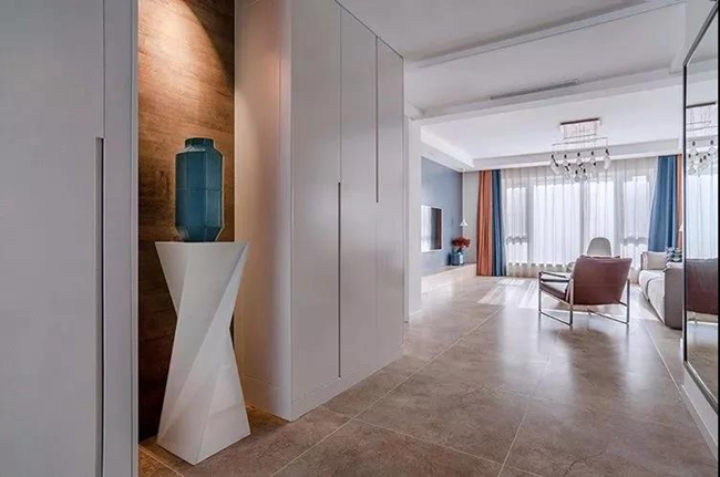 玄關進門后做了一個壁龕造型,擺上一只藍色的花瓶并在頂上裝一盞射燈,整個空間都顯得格外的溫馨精致。再往里則是通頂?shù)氖占{柜,白色的柜體也讓空間顯得更加的簡約現(xiàn)代。