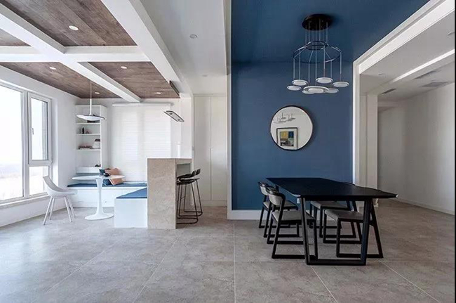 餐廳背景墻也是以雅藍色為主,中間掛上一個圓形的鏡子,搭配上禪意端莊的大餐桌椅,還有一套獨特的盤狀吊燈,顯得優(yōu)雅而高檔。臨著大面積落地窗邊,讓餐廳空間有著較好的采光,明亮寬敞。
