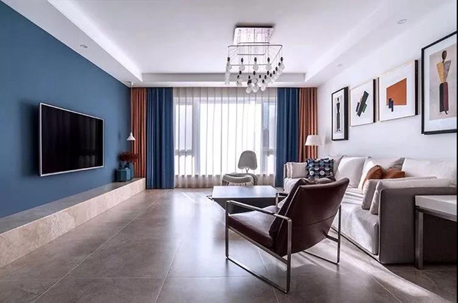 客廳以年輕的現(xiàn)代簡約風格基礎搭配,藍色電視墻搭配硬裝砌的電視柜臺面,以壁掛的電視機,整體顯得格外的簡約大方。暖灰色的地磚,搭配咖色的皮質(zhì)單人沙發(fā)椅,還有布藝主沙發(fā),簡單舒適、現(xiàn)代大方。