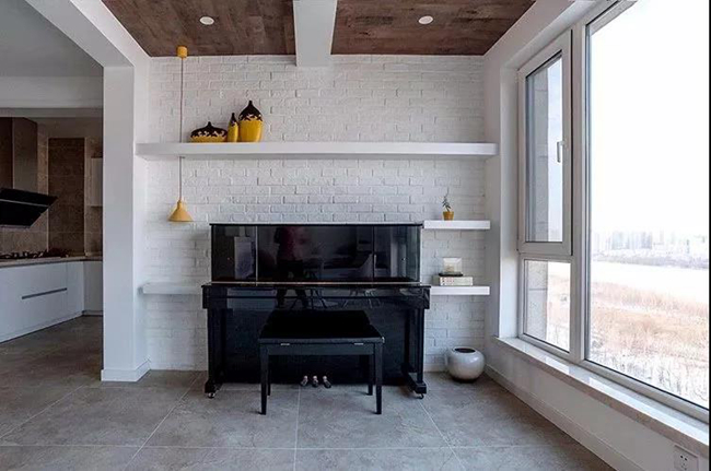在安靜之余,休閑區(qū)的另一端以白色文化磚+擱板為基礎,擺上一張黑色的鋼琴,靜中有聲,宛如坐在柳湖旁的一位優(yōu)雅女子,儒雅高尚。