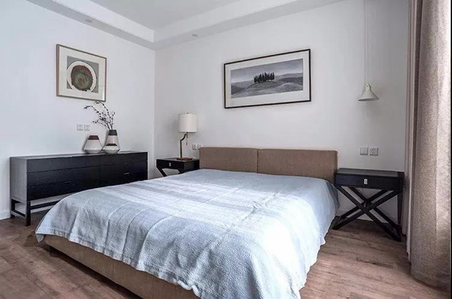 臥室空間同樣在簡約為主,木地板+簡潔的墻面,還有一張灰色的床單,搭配上黑色的床頭柜與斗柜,還有禪意極簡的軟裝點綴,細節(jié)處散著一絲舒適愜意的氣息。