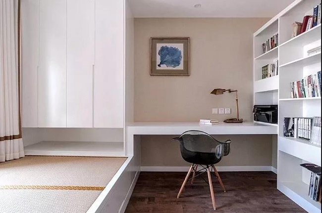 次臥以榻榻米+書桌+收納的組合設計,緊湊的空間裝出實用的功能,可以作為客房也可以做書房,空間利用巧妙精致。