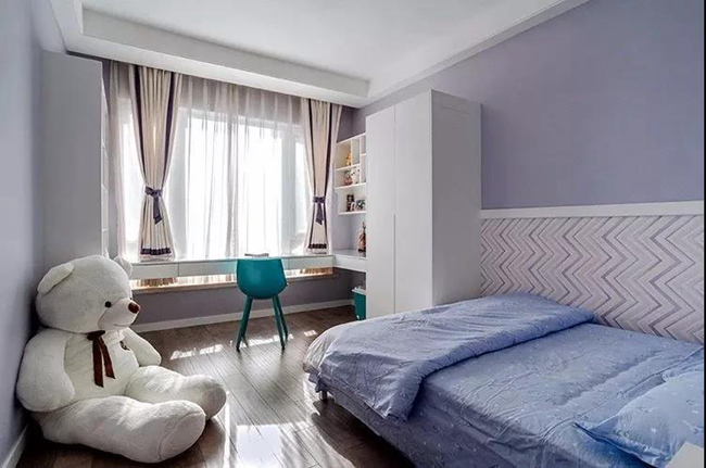 兒童房在淡淡的藍紫色為基礎下,墻腳部分是波浪紋的護墻板,配上一套淡藍色的床單,還有一只大公仔,充滿了輕松愜意的氣息。