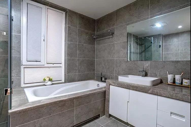 衛(wèi)生間裝了個浴缸,整體大理石與瓷磚封裝的空間,簡約時尚而又實用高檔。