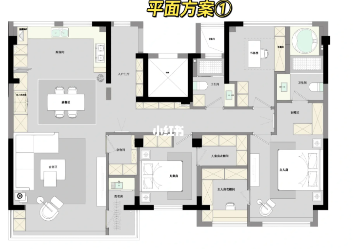 居室都在南面,一個大的套房作為主人的休息區(qū),另一個兒童房,適合小年輕居住,北面的空間主要是小書房和洗浴區(qū)域。