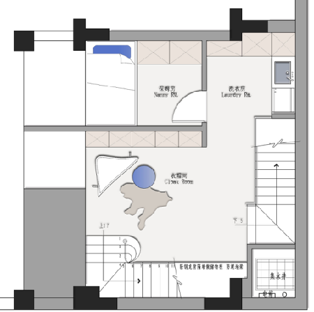 二樓設(shè)置了兩個(gè)房間,其中一個(gè)兒童房,在樓梯口上來的公共區(qū)域放置了小孩的三角鋼琴,上樓儀式感十足,旁邊一個(gè)挑空區(qū)域很浪漫優(yōu)雅,專為女主人打造。