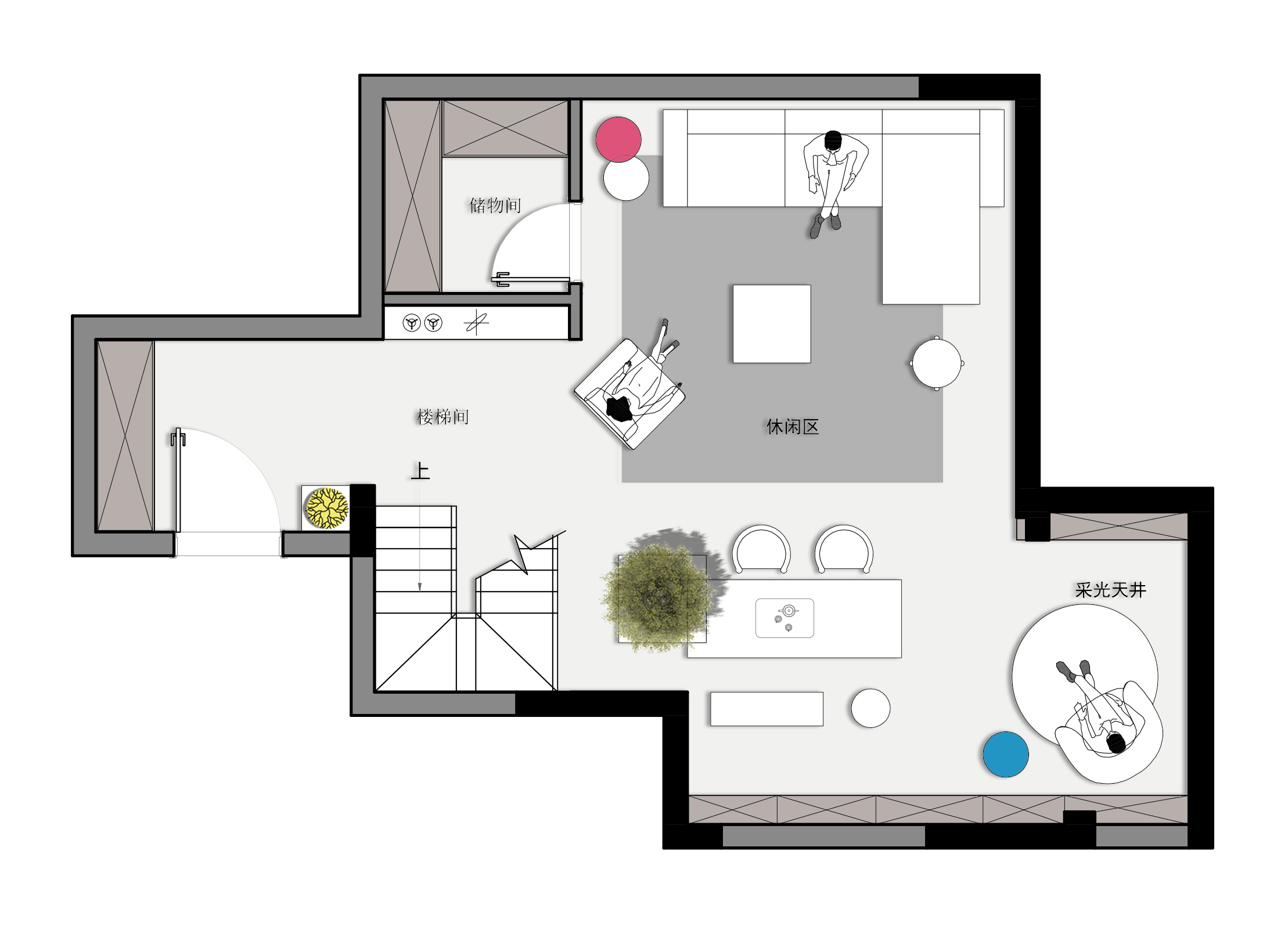 3?負(fù)一層保留了大挑空,結(jié)合少量現(xiàn)澆,把空間變得更方正,利用率更高。將北面采光井也納入室內(nèi)規(guī)劃范圍,難處理的Z字形承重柱用柜子做裝飾,滿足了儲(chǔ)物需求,空間也更加美觀。這個(gè)空間主要作為多功能的書(shū)房和儲(chǔ)物間來(lái)使用,滿足客戶工作、