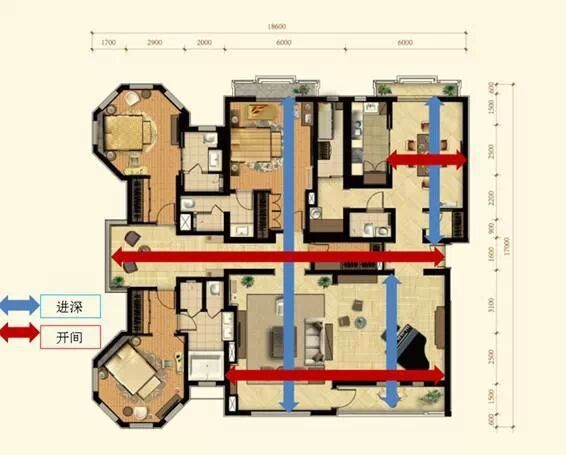 開(kāi)間、進(jìn)深:習(xí)慣上,我們把房間的主采光面稱為開(kāi)間(面寬),與其垂直的稱為進(jìn)深。也可根據(jù)房間門的朝向來(lái)確定開(kāi)間和進(jìn)深,房門進(jìn)入的方向的距離為進(jìn)深,左右兩邊距離為開(kāi)間。