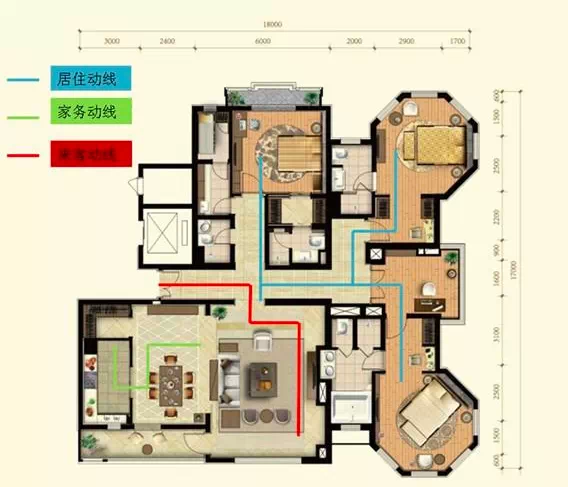 好的動(dòng)線能夠提升戶型利用率,而差的動(dòng)線會(huì)使大戶型變得“大而無(wú)當(dāng)”,浪費(fèi)空間。戶內(nèi)主要?jiǎng)泳€有三類,分別是居住動(dòng)線、家務(wù)動(dòng)線、來(lái)客動(dòng)線。