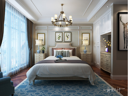 2、燈具選擇安裝:臥室的照明中,天花燈應安裝在光線不刺眼的位置;臥室不宜采用向下照射的燈具,宜用照頂?shù)臒艄?床頭燈可使室內更具浪漫溫馨的氣息;臥室的光源色調應盡量柔和,設計要考慮寧靜穩(wěn)重或是浪漫舒適的強調。