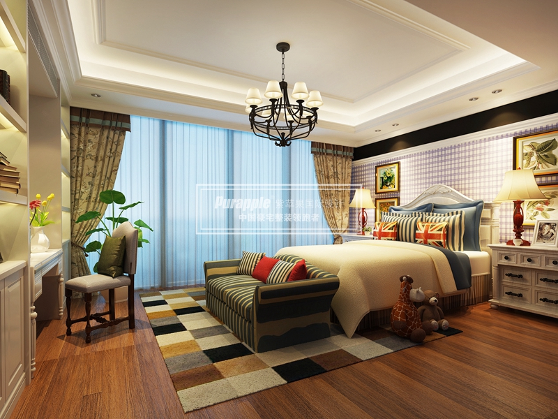因?yàn)槊朗郊揖语L(fēng)格的這些元素也正好迎合了時(shí)下的文化資產(chǎn)者對(duì)生活方式的需求,所以:有文化感、有貴氣感,還不能缺乏自在感與情調(diào)感。從圖中臥室中窗簾,背景墻,沙發(fā)以及地毯又加上實(shí)木的地板總體的顏色搭配與色調(diào)全全體現(xiàn)了美式風(fēng)格的一個(gè)文化與貴氣。當(dāng)然再加上燈具以及一些家居的呼應(yīng),或許你已經(jīng)覺得自己置身在美國家中。