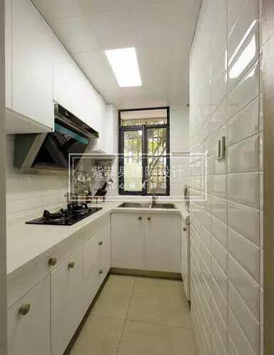 狹長(zhǎng)的廚房全部采用白色主材,顯得空間明亮整潔。