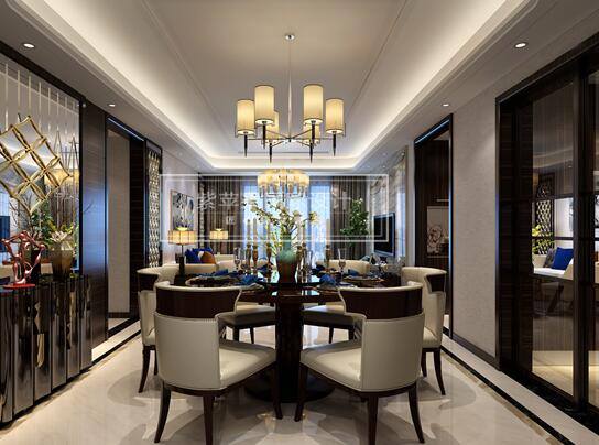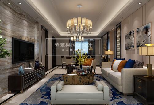 沙發(fā)背景墻上的金屬序列顯得富有哲學(xué)感和空間藝術(shù)的味道,簡單的電視背景墻沒有做太多的裝飾,電視背景墻整面貼石材和木的完美細節(jié)收口顯的極為精致。一進客廳就能感受到空間的層次感,令空間視覺擴大了很多。客廳地面也是采用的飄逸的紋理石材。沙發(fā)圍繞著茶幾,沙發(fā)獨立成組靠在一角,吊燈更是新穎浪漫,給人一種舒適安靜的感覺。