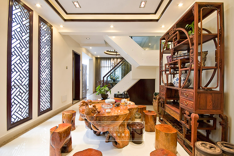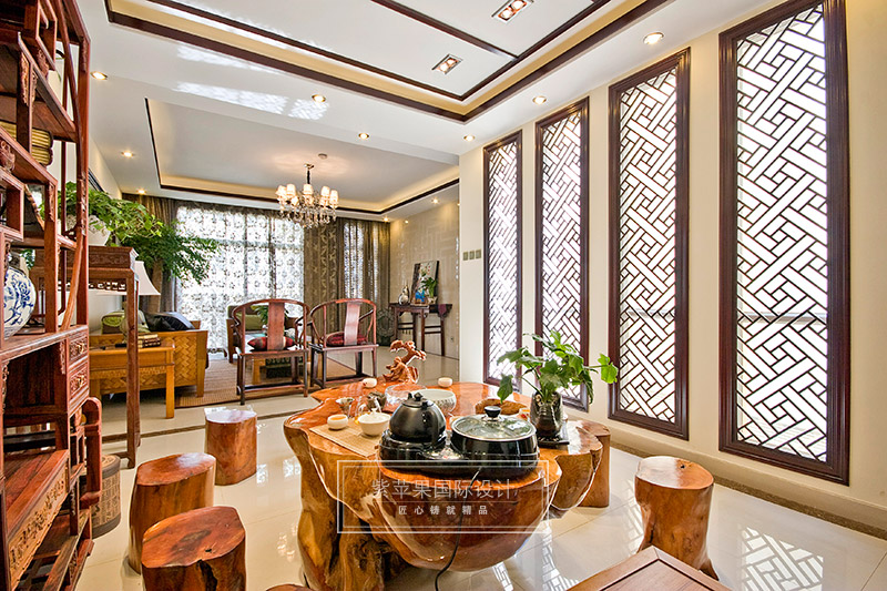 木質(zhì)家具的雕花,優(yōu)美而富有韻味,結(jié)合古典氣息濃厚的珍藏品,茶具等陳設(shè)品,打造靜謐、雅致、文化氣息濃厚的氛圍,體現(xiàn)主人高深的文化修養(yǎng)。