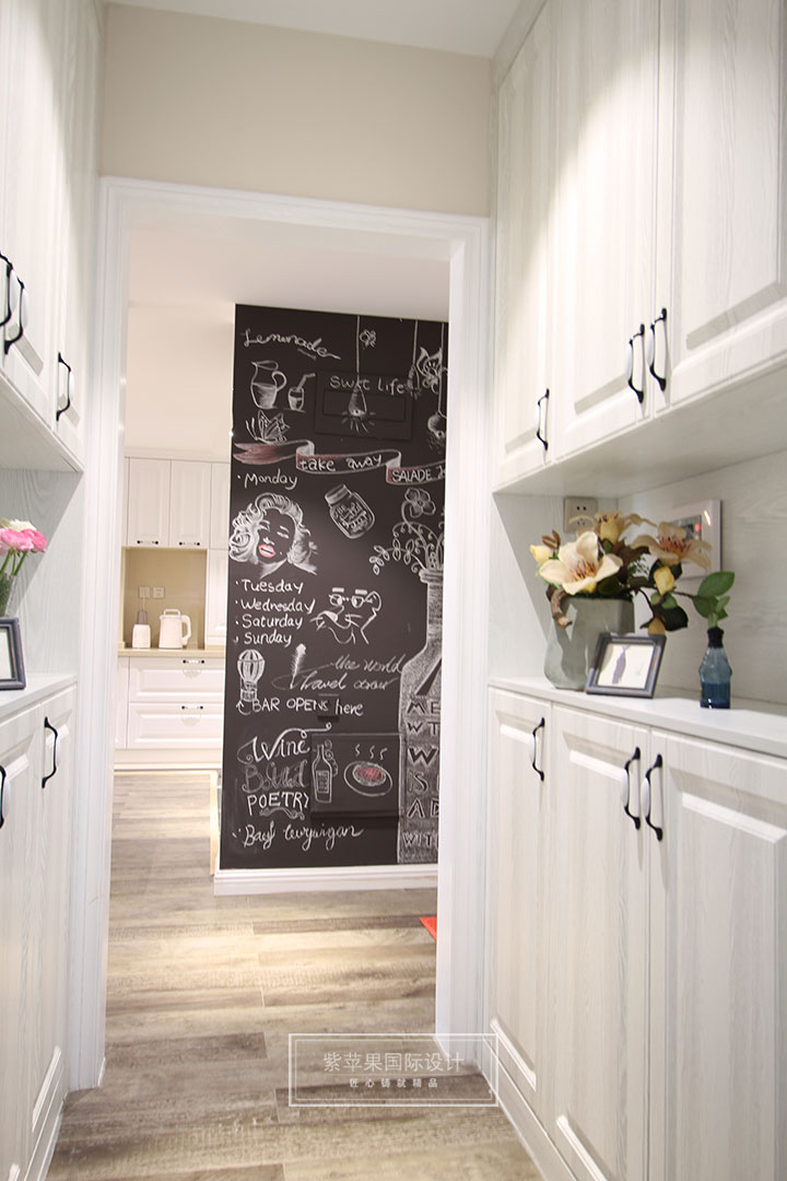 設(shè)計(jì)師將門(mén)廳旁的過(guò)道空間加以改造,設(shè)計(jì)成兼顧換鞋及更衣的更大儲(chǔ)物空間。入戶(hù)整面黑板墻讓女主人能夠盡情揮灑回憶與無(wú)限的想像力。