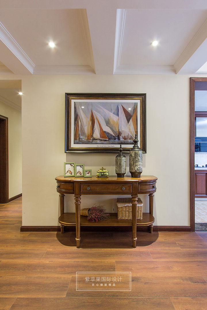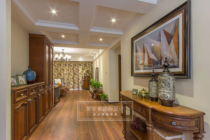 開門第一道美景,風景油畫的淡雅與清新點綴在古典氣息的家具當中,搭配自然氣息濃厚的裝飾品,于古典中帶有一點隨意,摒棄了過多的繁瑣與奢華。營造出閑散與自在,溫情與柔軟的氛圍,給業(yè)主一個真正溫暖的家。