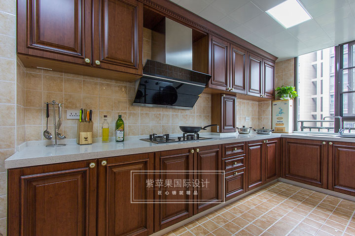 開放式廚房使用仿古面的墻地磚,懷舊古樸,開闊整潔的臺面,木質(zhì)柜體,打造廚房的簡約大氣。