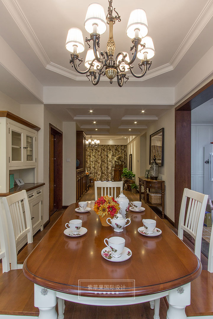 原木材質(zhì)的餐桌有古典味道,搭配以白色家具,餐具,鐵藝燈,傳遞清爽素雅的味道,反映業(yè)主質(zhì)樸而實用的生活態(tài)度。