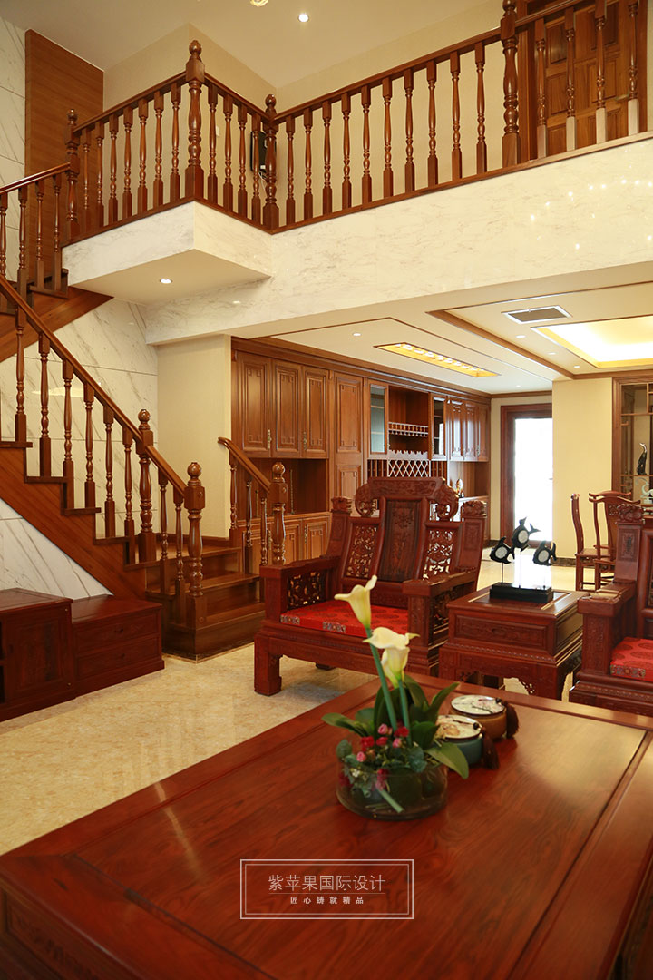 客廳空間高大開闊,色彩濃重而成熟,中式的元素在空間里的運用巧妙??傮w布局對稱均衡,端正穩(wěn)健,而在裝飾細節(jié)上,崇尚自然情趣,如抱枕圖案,窗簾花紋等飾以花鳥,蟲魚等精雕細琢,富于變化,充分體現(xiàn)出中國傳統(tǒng)美學精神。