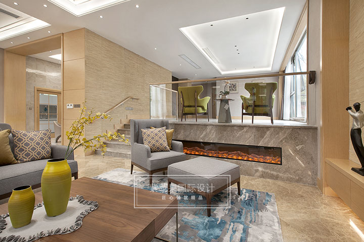 客廳設(shè)置內(nèi)嵌式電子壁爐,巧妙創(chuàng)新有樂趣;錯層處運用玻璃扶手,增強(qiáng)整個空間通透之感,讓視線廣闊無遮攔。電子壁爐和玻璃扶手的運用,都可以看出設(shè)計師從細(xì)節(jié)出發(fā)極力在營造一個精致、大氣、現(xiàn)代感十足的生活空間。