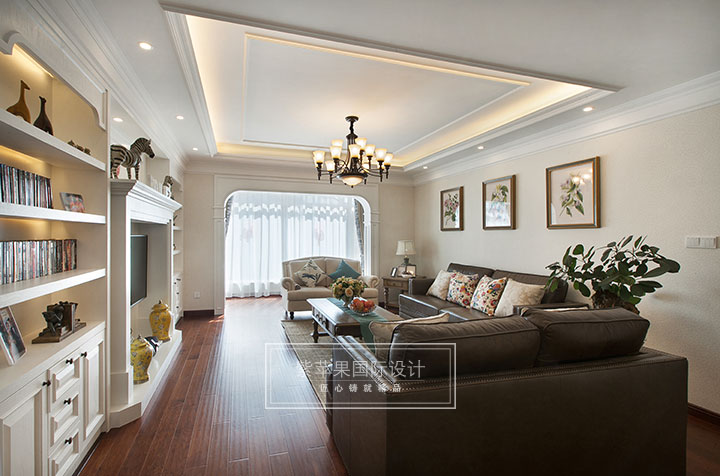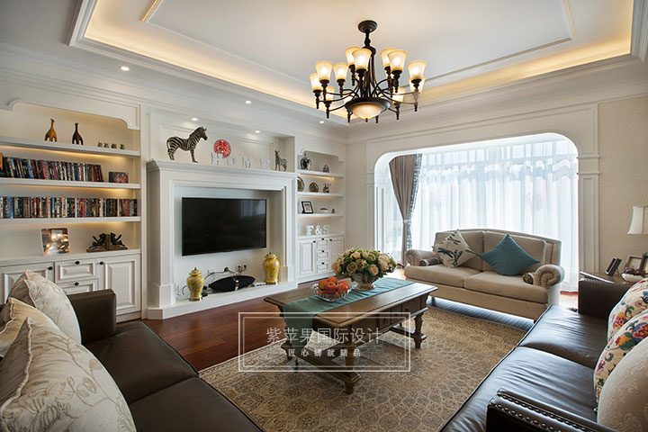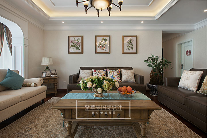 皮質(zhì)加布藝的沙發(fā),搭配木質(zhì)的茶幾,體現(xiàn)了經(jīng)典的美式風(fēng)格,既休閑浪漫又華美貴氣。白色的背景墻和門框使得客廳光線明亮,純白輕盈的窗簾干凈清新,能夠最大程度的透進(jìn)明媚陽(yáng)光。