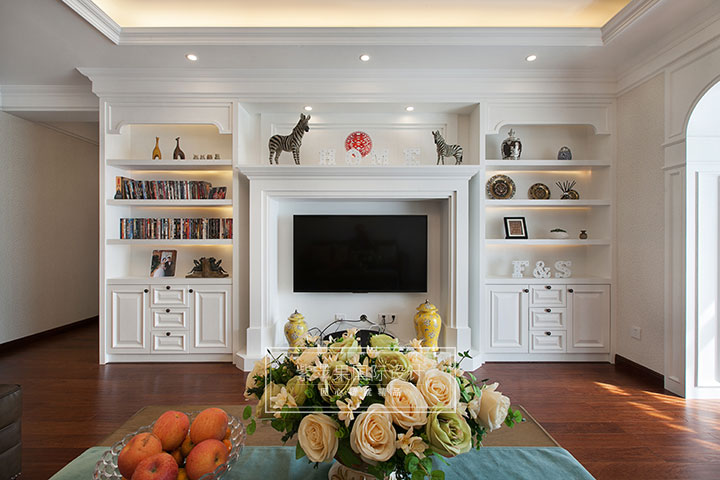 電視機(jī)背景墻在兩側(cè)設(shè)置了書柜,簡(jiǎn)約實(shí)用,為主人增添了儲(chǔ)物空間??梢噪S意擺放自己心愛的書、相片、擺件等等。