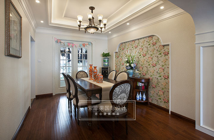 簡(jiǎn)約古典的吊燈散發(fā)出溫和的光線,光線灑落在高檔優(yōu)雅的木質(zhì)餐桌上,很好的營(yíng)造出了溫馨的用餐氛圍?;ɑ茉氐膲埡彤嫷倪\(yùn)用,使得用餐環(huán)境更加輕松悠閑。