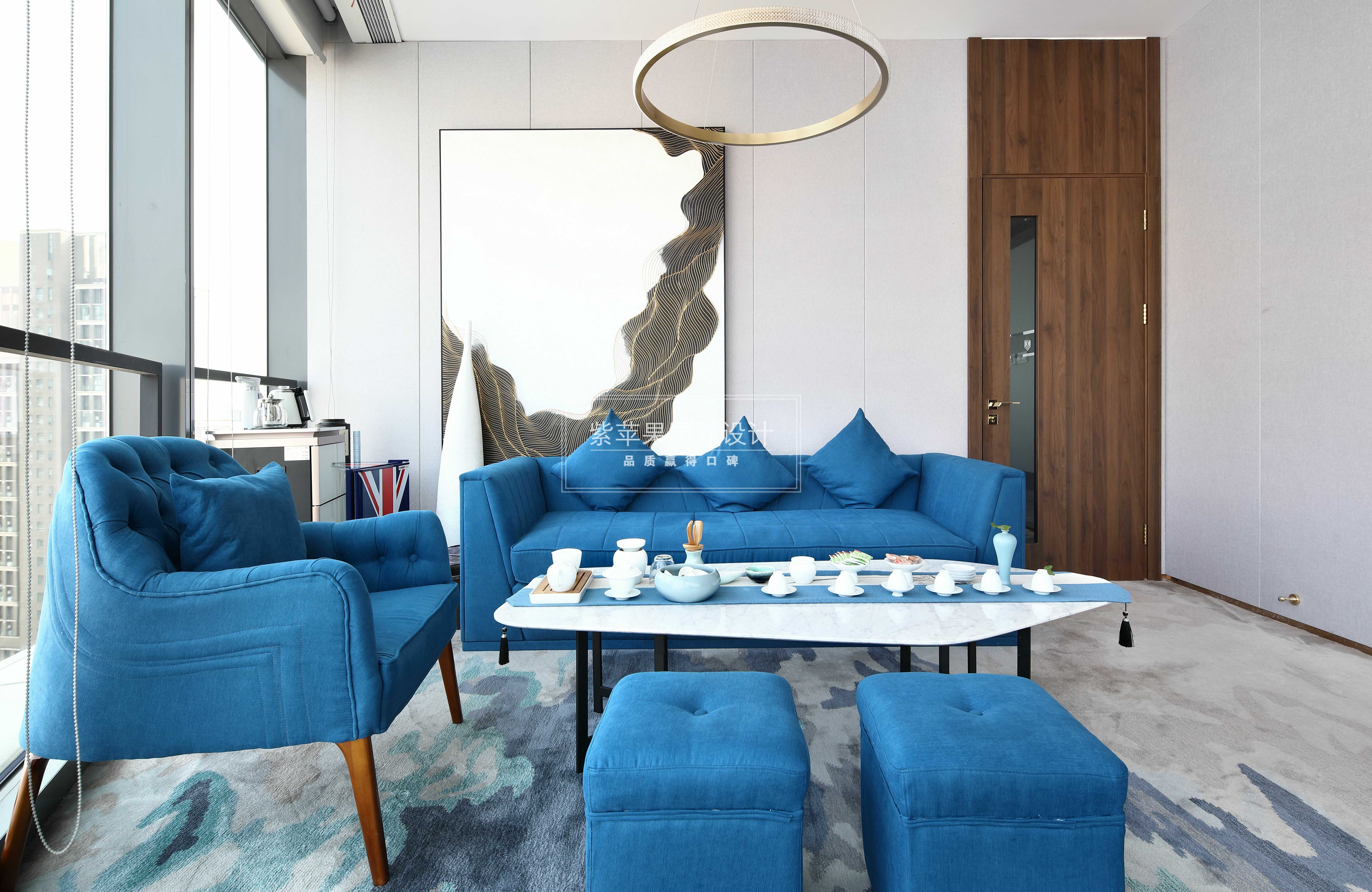 洽談區(qū)選用湖藍(lán)色作為軟裝布藝沙發(fā)的主基色,與水波紋的地毯搭配的恰到好處。矮桌上的淺藍(lán)色茶具精致小巧,室內(nèi)不同明度的藍(lán)色在色調(diào)上保持一致,給人視覺上柔和素凈的感官體驗。