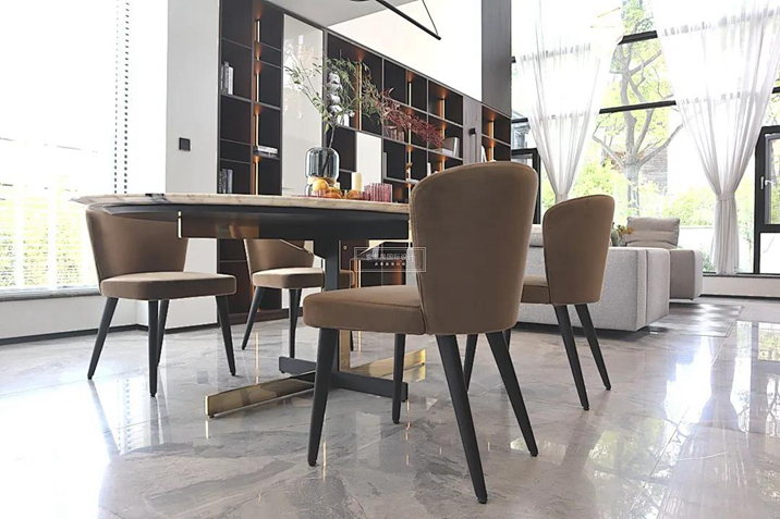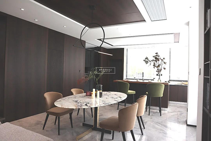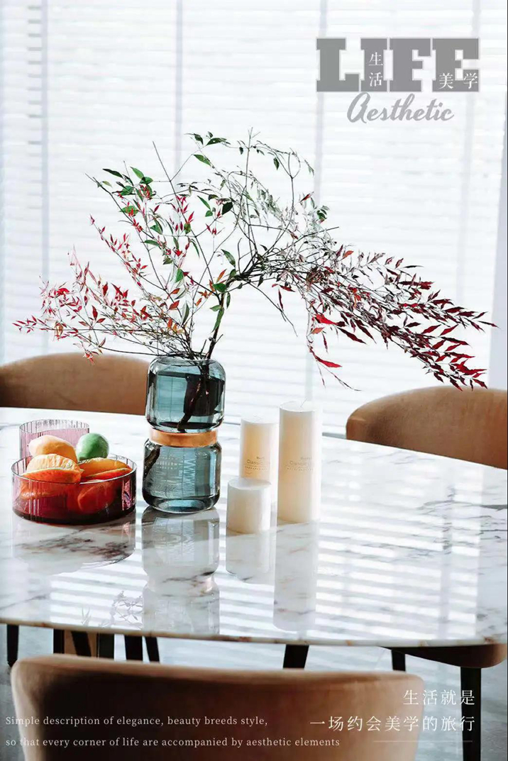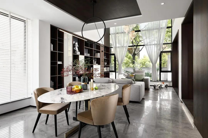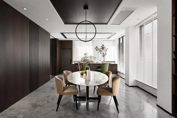 餐廳區(qū)域簡(jiǎn)潔明快,大理石巖板的桌面光彩照人,自然紋理和花木映照疊疊重重相得益彰。