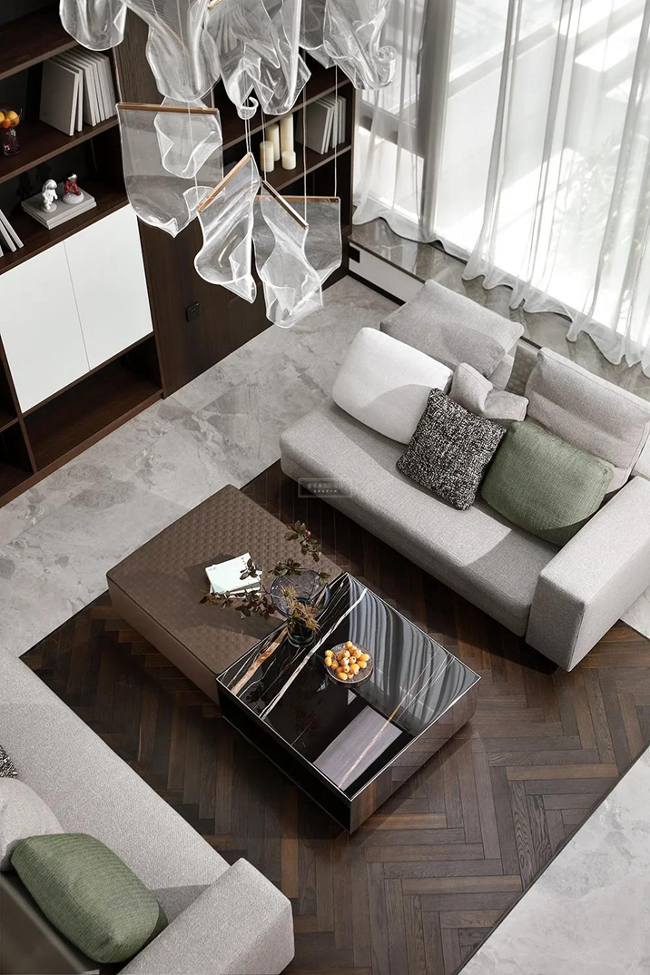 客廳本身的大挑空讓空間更有拉伸,參考行云流水的元素的精美吊燈打開(kāi)生活新的美學(xué)表達(dá)。