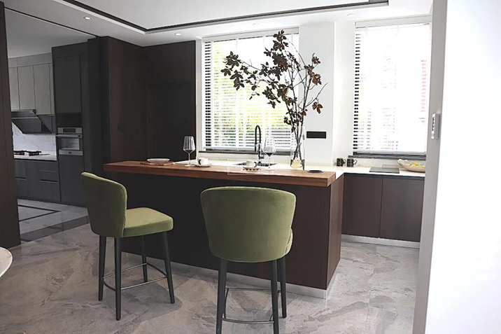 廚房區(qū)分為中西廚,考慮中廚習(xí)慣規(guī)避隱患提升居住品質(zhì),增加西式吧臺(tái)為多樣生活提供更多的選擇性。