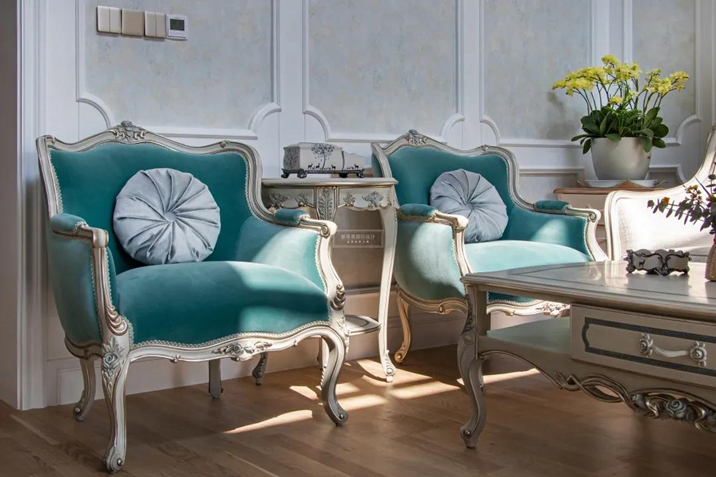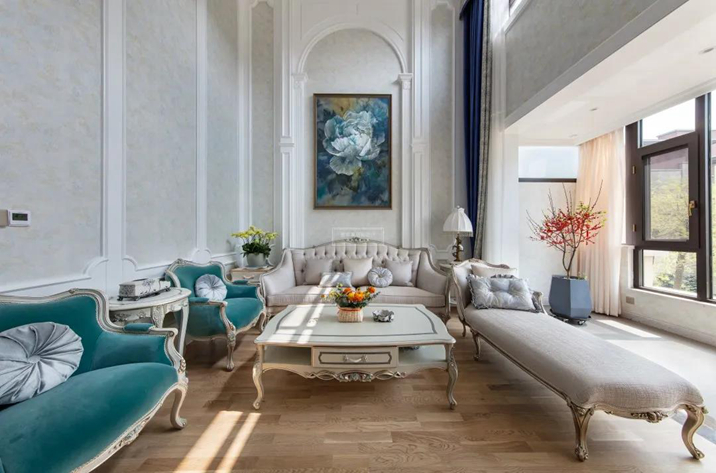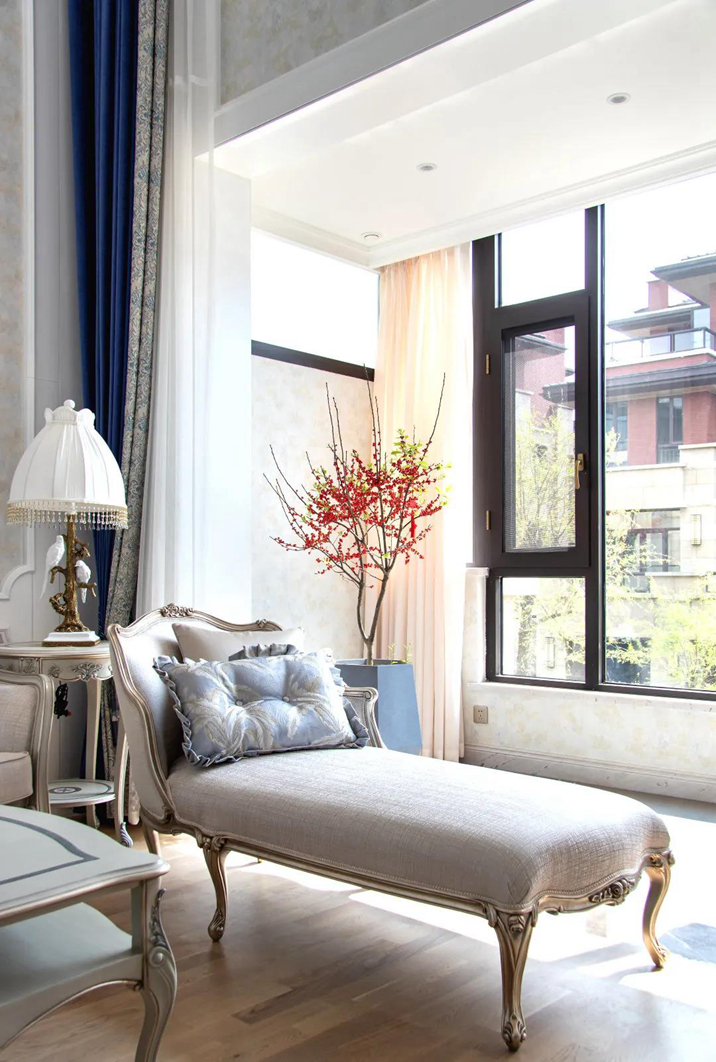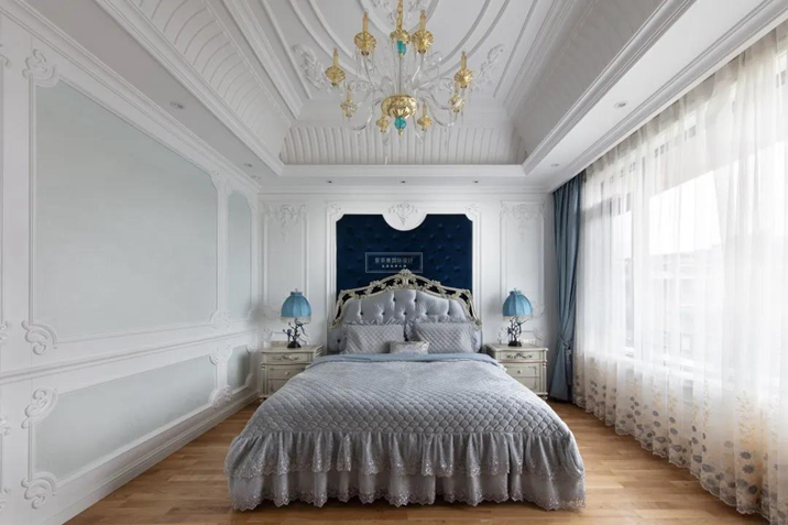 天花板、墻壁石膏雕花線條配合著絨布軟包的背景墻,獨(dú)占這一室的雅致輕盈。